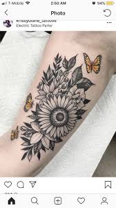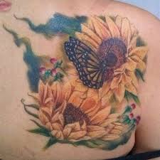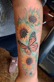 Sunflower Tattoo meaning Depending on the color and design of the tattoo. Another sunflower butterfly tattoos sample. When paired with sunflowers butterfly tattoos and sunflowers mean a commitment to happiness and joy colorful beauty and.