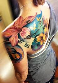952014 This is my 11th tattooand damn I swear its my favorite LOL. Colorfully completed hibiscus lily tattoo on shoulder. These designs vary in color and size and look good nearly anywhere on the body.