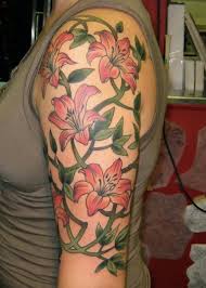 Here is a tribal flower tattoo design around the waist of this girl. Womens half sleeve and shoulder tattoo of orange and black lilies with criss-crossing green vines with lots of leaves. Lily tattoo might be the 2nd popular flower tattoos with rose tattoos as number one.